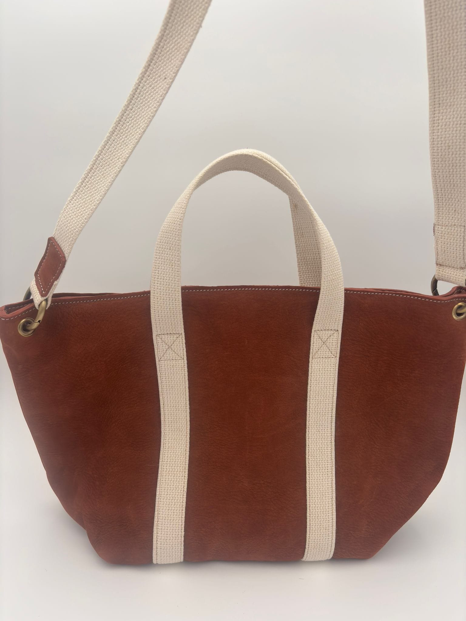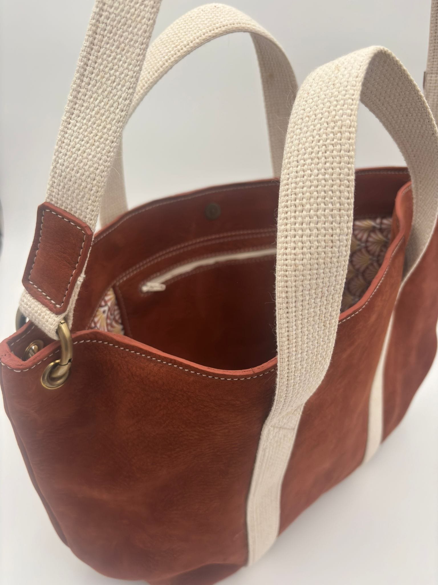 Sac artisanal en cuir de taurillon nubuck (46 × 30 × 20 cm), issu d’un tannage minéral. La fleur du cuir, légèrement poncée puis huilée, offre un aspect nubuck élégant et un toucher cireux et doux, révélateur d’un savoir-faire maroquinier haut de gamme.