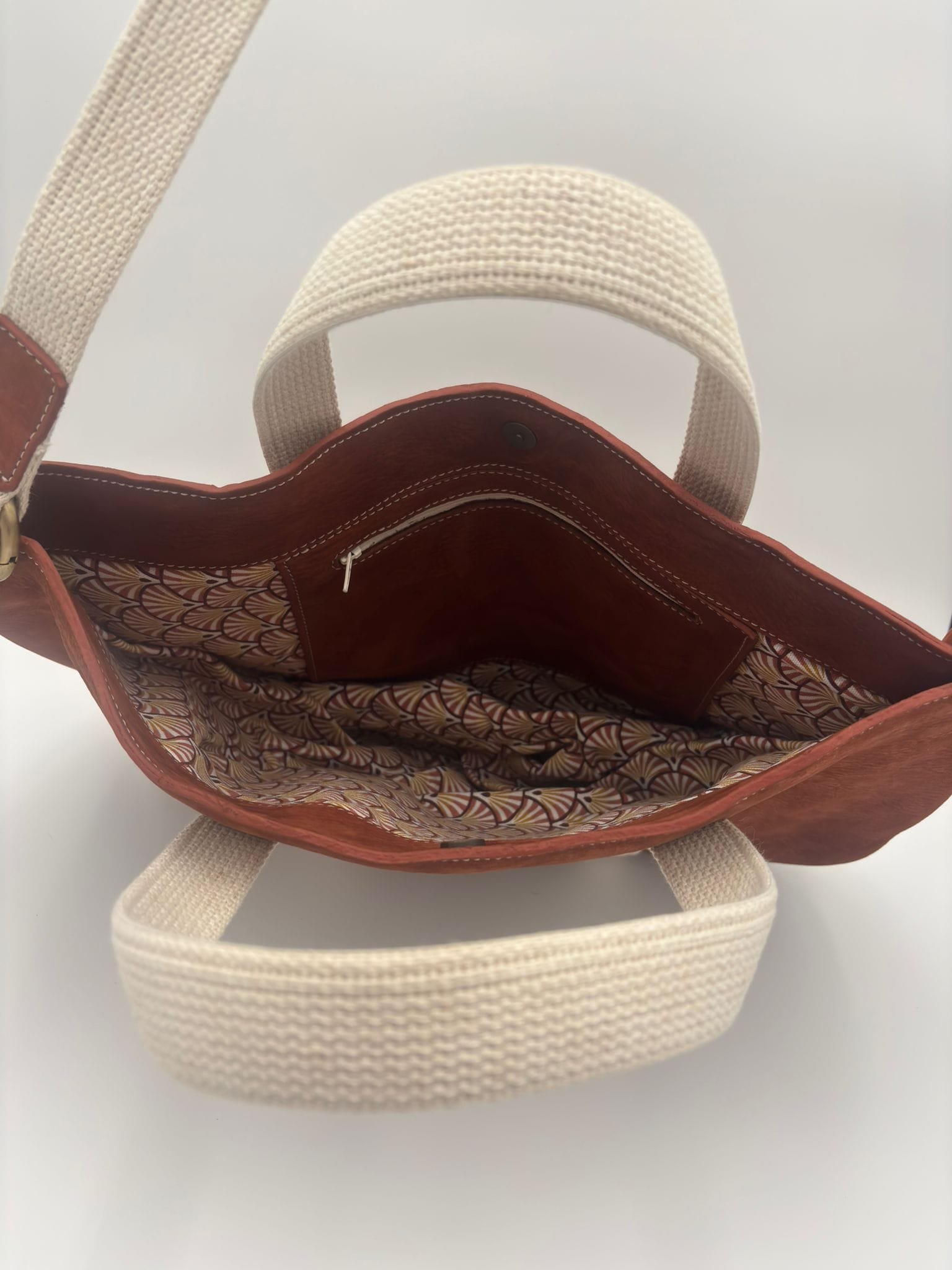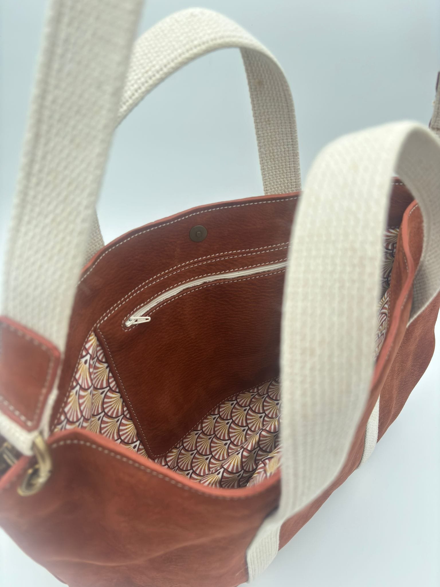 Intérieur doublé d’un tissu géométrique avec poche plaquée. Poignée et bandoulière amovible en sangle moissonneuse, reconnue pour sa grande résistance.